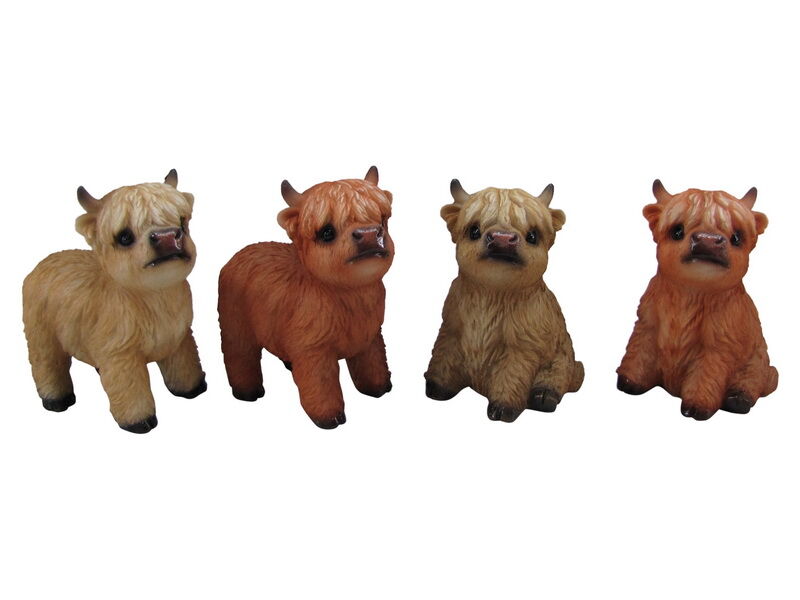 - Set of 4 Highland Cow Figurines, includes Standing Light Brown, Standing Brown, Sitting Light Brown, and Sitting Brown cows
